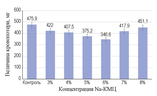 Величина кровопотери снижалась в изученных образцах сходным образом (рис. 3): наибольший эффект отмечен у Na-КМЦ 6%, для которого снижение кровопотери относительно группы контроля составило 27%; далее по степени убывания эффекта: Na-КМЦ 5% — уменьшение кровопотери на 21%, Na-КМЦ 4% — на 14%, Na-КМЦ 7% — на 12%, Na-КМЦ 3% — на 11% и Na-КМЦ 8% — на 5%. При сравнении всех исследованных концентраций геля Na-КМЦ с группой контроля по времени кровотечения и величине кровопотери различия статистически значимы: р < 0,01.