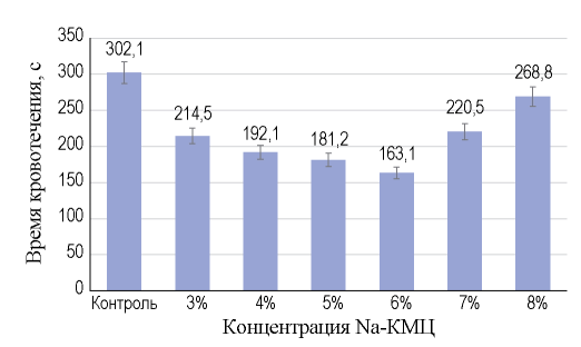 Острый эксперимент in vivo Анализ времени остановки кровотечения показал, что все изучаемые образцы статистически значимо снижали данную величину относительно контрольной группы (рис. 2). Наиболее выраженный эффект отмечен у Na-КМЦ 6%, который уменьшал время кровотечения на 46%; далее по степени убывания эффекта следовали: Na-КМЦ 5% — уменьшал время кровотечения на 40%, Na-КМЦ 4% — на 37%, Na-КМЦ 3% — на 29%, Na-КМЦ 7% — на 27% и Na- КМЦ 8% — на 11%.