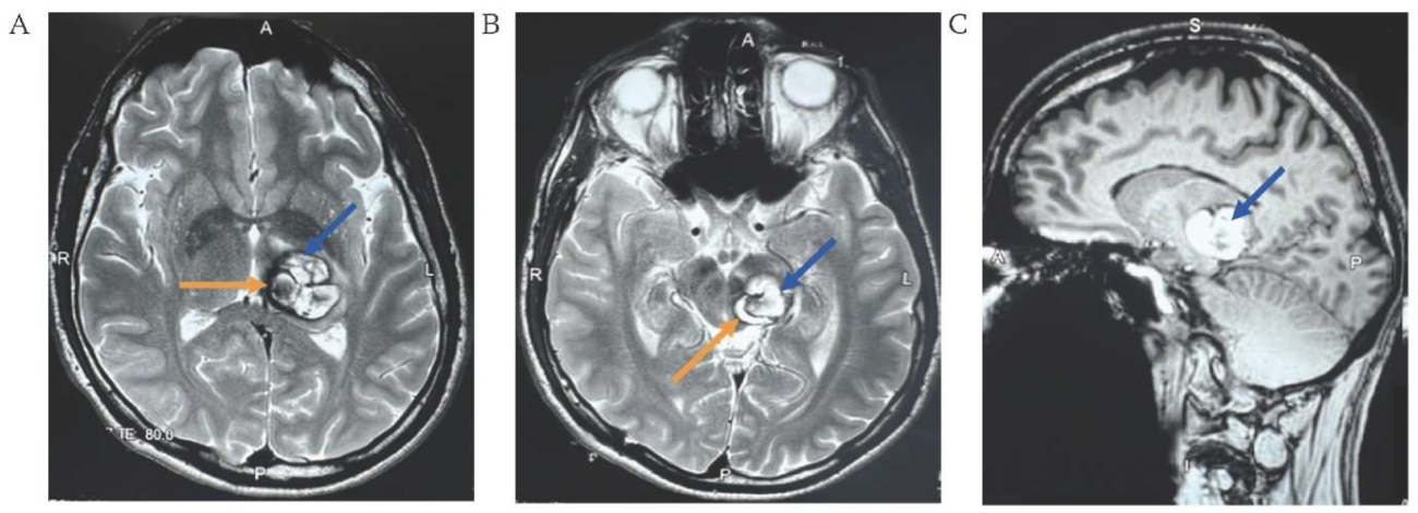 A, B. Axial sections, T2-weighted image: cavernous malformation (blue arrow), hematomas in the cavernoma (orange arrow).