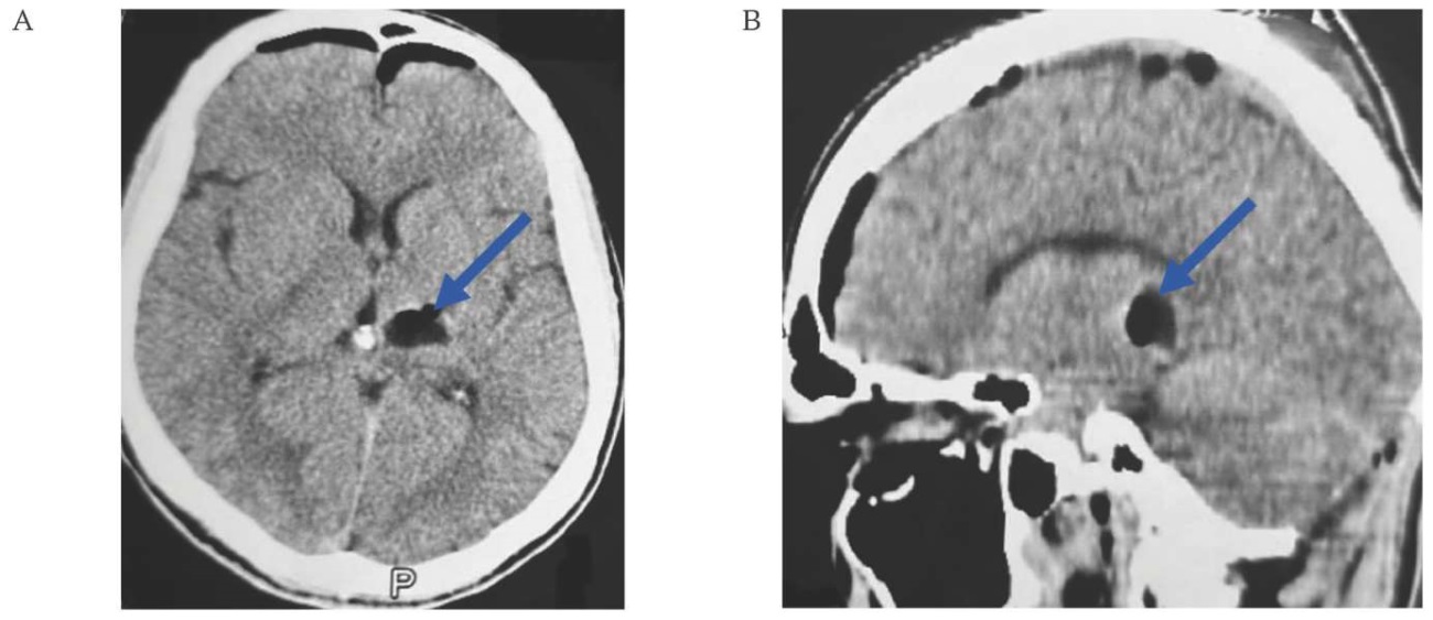 A control CT scan in the postoperative period was performed on the third day; according to the study data, the condition after median suboccipital craniotomy, residual cavernoma, and repeated hemorrhage were not detected (Fig. 4A, B).