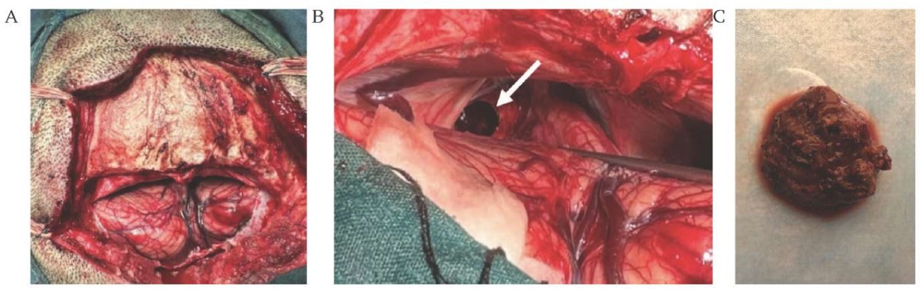 With a minimal incision in the dorsal part of the midbrain (Fig. 3B), the cavernoma was completely resected together with the surrounding subacute hematoma measuring 2×3×2.5 cm (Fig. 3C). Hemostasis was achieved until the lavage water was clear. A hemostatic collagen sponge was placed in the cavernoma bed. The dura mater was sutured hermetically. The bone flap was fixed with threads. Layer-by-layer suturing of the wound was performed. An aseptic dressing was applied. The total blood loss was 250 ml.