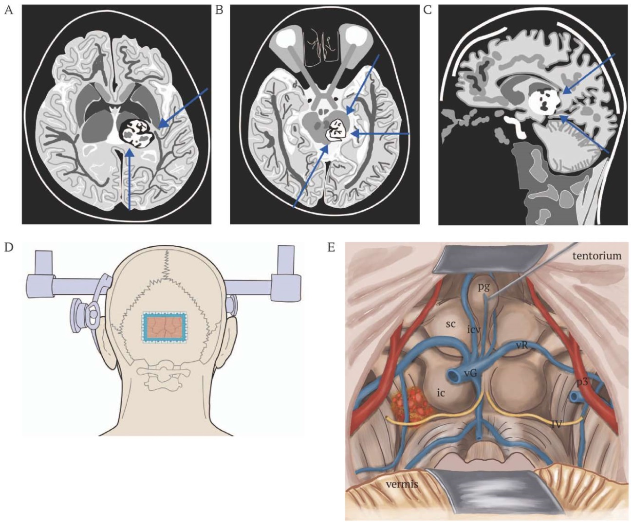 The supracerebellar infratentorial approach in the sitting position opens the anatomical plane so widely that dissection is significantly facilitated. Any discomfort from working with raised arms is compensated by the panorama without a retractor and the operative field cleared by gravity (Fig. 3A). Arachnoid dissection was performed, and large deep veins (V. Galen, internal cerebral veins, internal occipital veins, basal veins of Rosenthal, pericentral veins of the cerebellum) were identified. The contralateral approach allowed visualization of the IV pair of cranial nerves and the P3 segment of the posterior cerebral artery.