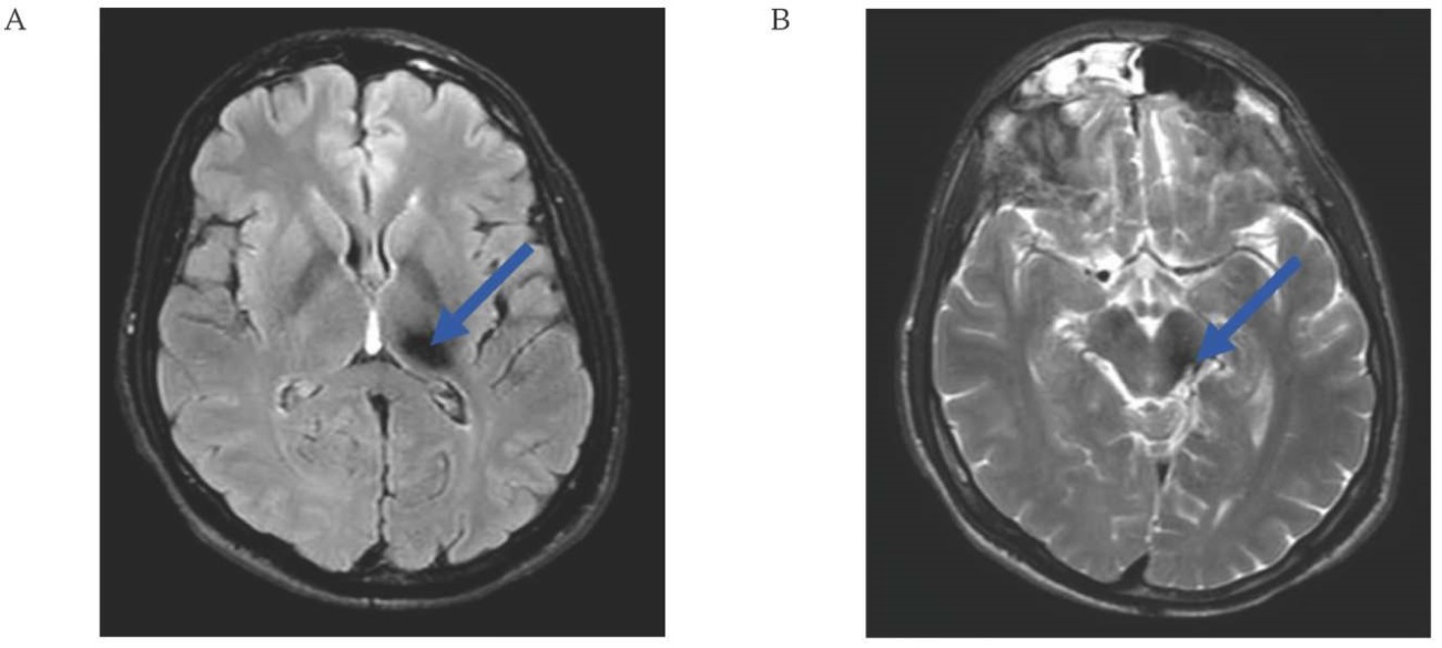 A MRI of the brain was undertaken on February 18, 2025, and here we can observe the brain’s condition after removal of the cavernoma. The MR showed signs of postoperative gliosis changes. No residual cavernoma or recurrent hemorrhage was detected (Fig. 5A, B).