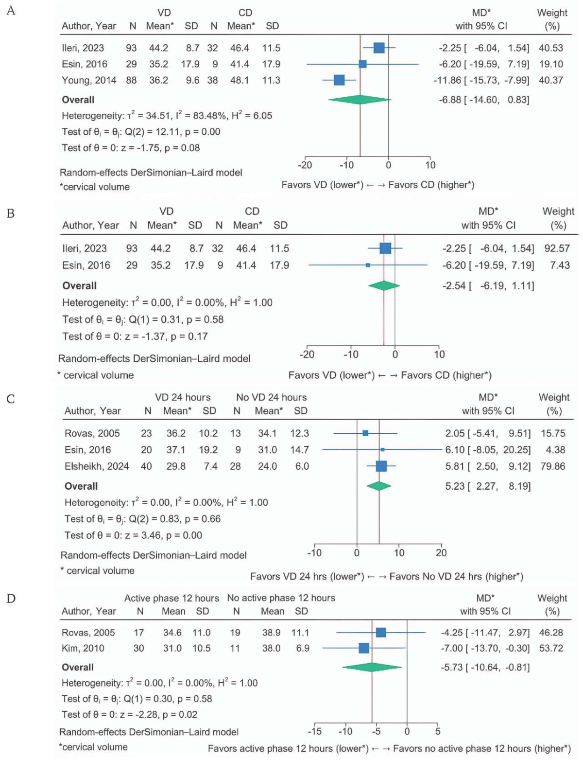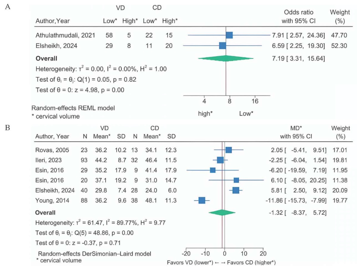 Data for pooling was divided into two types: cut-off data and frequency data. For studies with a cut-off, a comparator was implicitly defined (e.g., cervical volume above vs below the threshold), and the data were analyzed as binary outcomes using OR with 95% CI. For studies without a cut-off, cervical volume was considered as a continuous variable, and the data were pooled using mean difference (MD) with 95% CI. The cervical volume data was converted to mean and standard deviation when reported as a median, range, or interquartile range [13]. A random-effects meta-analysis was performed to account for potential heterogeneity across the trials. Leave-one-out sensitivity analyses were performed to assess the robustness of pooled estimates. Heterogeneity was assessed using Cochran’s Q test and Higgins’s I² statistic, where an I² more than 50% was considered indicative of substantial heterogeneity [14]. Meta-regression and subgroup analyses were pre-specified to explore potential sources of heterogeneity, including outcome definitions, measurement techniques (2D vs 3D), ultrasound route, parity, IOL indications, and geographic region. Publication bias was evaluated using Deeks’ funnel plot and Egger’s test [15]. A two-sided p-value <0.05 was considered statistically significant, except for the heterogeneity of Egger’s tests, where a p-value <0.1 was used. The statistical analyses were conducted using STATA software package, version 18.0. (Stata Corp, College Station, Texas, USA).