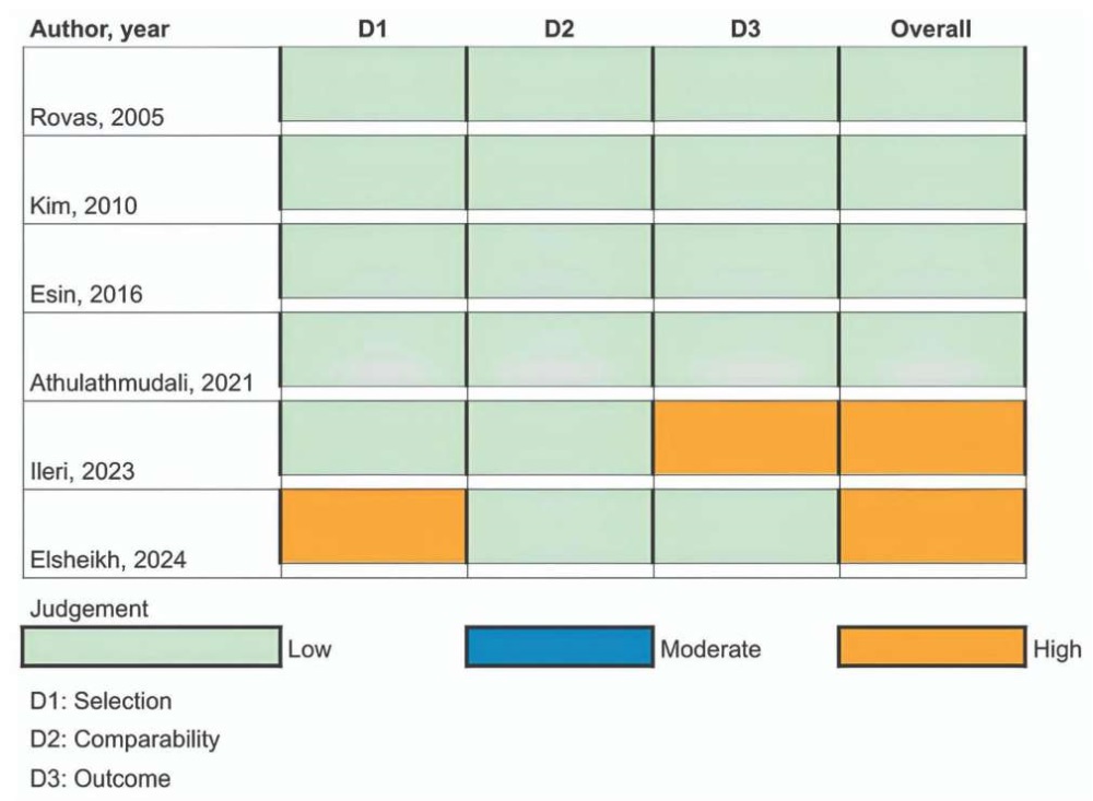 Two reviewers (P.K. and P.C.) independently assessed the risk of bias in the studies using the modified Newcastle-Ottawa scale, a validated tool for assessing the quality of non-randomized studies4. This scale evaluates three domains of bias: selection of the representativeness of the study participants, comparability between groups, and ascertainment of outcomes and study factors. Each item contains a question with three possible answers: yes, no, or unclear. The scale assigns scores ranging from 0 to 9 stars. Individual studies were categorized according to these stars; those with 7 to 9 stars were classified as having a low risk of bias, those with 4 to 6 stars as having a moderate risk of bias, and those with 0 to 3 stars as having a high risk of bias. The third reviewer (M.S.) resolved any disagreements.