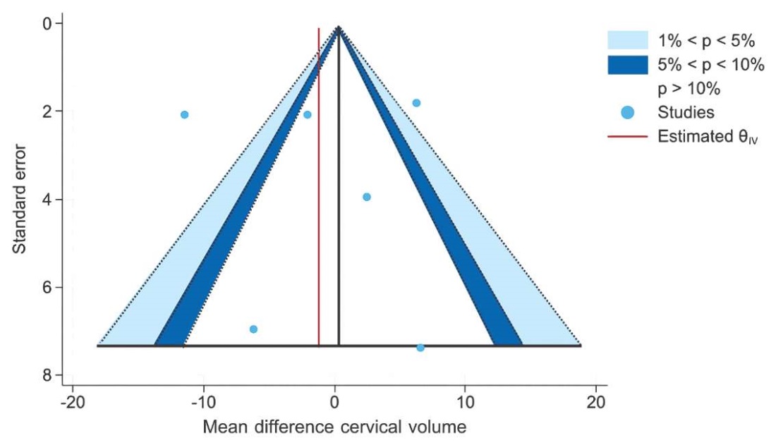 Results. Seven studies involving 534 pregnant women were included. Four studies were considered low risk of bias and two studies were regarded as high risk of bias. Risk of bias assessment could not be performed in one study because the full-text of the article was not available. The pooled analysis of two studies involving 168 pregnant women demonstrated a positive association between the lower cervical volume and successful vaginal delivery within 24 hours (odds ratio 7.19; 95% confidence interval: 3.31 to 15.64; = 0%). The pooled analysis of five studies involving 422 pregnant women showed no statistically significant difference between successful and failed IOL, with a mean difference –1.32 cm3; 95% confidence interval: –8.37 to 5.72; = 89.8%). Subgroup analyses showed no statistically significant association between cervical volume and successful IOL when defined as vaginal delivery without time restriction or within 24 hours. However, a significantly lower cervical volume was observed in women who achieved the active phase of labor within 12 hours. The Egger’s regression test confirmed the absence of small‑study effects (coefficient = 0.50, standard error = 1.75, p = 0.78).