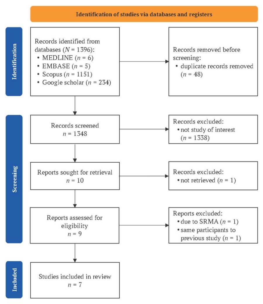 Data were collected from three databases: EMBASE, MEDLINE, Scopus, and from Google Scholar. Studies from the reference lists of reviews, protocols, abstracts, and grey literature were also searched and selected. In total, 1396 eligible studies were included. Among these, 48 were excluded due to duplication. After screening the titles and abstracts, seven studies met the inclusion criteria and were incorporated into the final meta-analysis (Fig. 1).