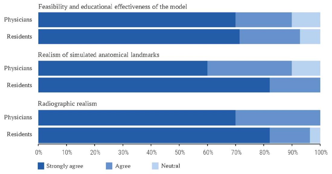 Also, participants completed a post-training questionnaire based on a Likert scale to access the perceived feasibility and educational value of the simulator, the anatomical realism of landmarks and radiographic realism with scores: strongly agree (5), agree (4), neutral (3), disagree (2), strongly disagree (1) [13].