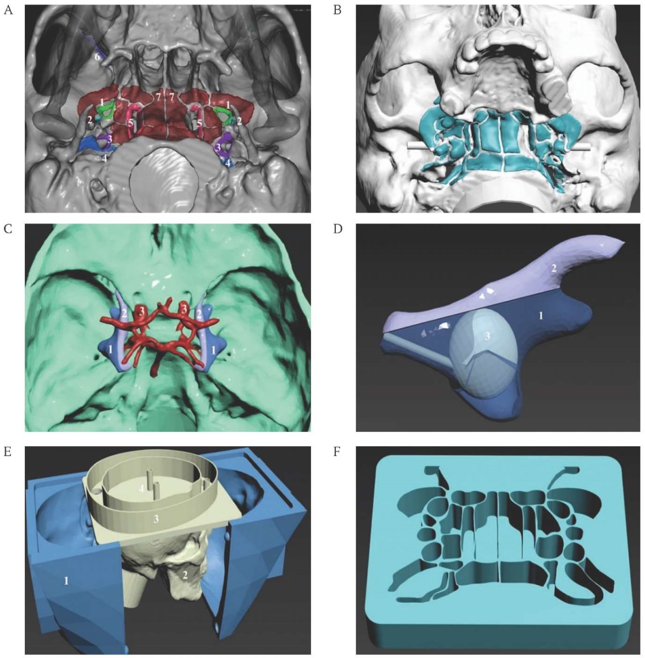 Using the Inobitec DICOM Viewer software (Inobitec DICOM Viewer Pro licensed software, Inobitec LLC, Russia), artifact removal and segmentation were performed for the following structures based on native DICOM data: the skull base, contact zones in the skull base region (including the inferior orbital fissure, jugular foramen, external opening of the temporal carotid canal, lacrimal foramen and spinous foramen), GG, and internal carotid artery (Fig. 1A).