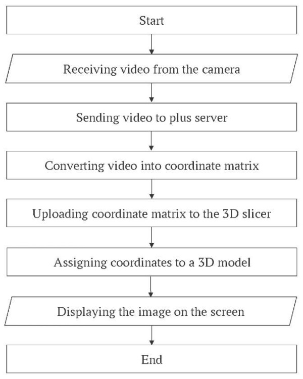 Finally, a portable neuronavigation system was developed to reduce radiation exposure for trainees. To simulate the puncture intervention, an integrated hardware-software complex utilizing computer vision technologies was employed. Video tracking of the surgical instrument was achieved by detecting fractal markers in the form of QR codes affixed to the instrument. The streaming image was captured and transferred to a personal computer, where it was processed using the PLUS Server application (open-source software, Plus Toolkit Community and PerkLab) [11]. In this system, AI algorithms convert the incoming video stream into a matrix of spatial coordinates. These coordinates are subsequently transferred to a dedicated visualization platform – 3D Slicer software (open-source license) [12]. The resulting spatial data were mapped onto a virtual environment within 3D Slicer, where the coordinates were assigned to a 3D model of the surgical instrument. This allowed dynamic visualization of its interaction with the 3D training model of the head on the monitor screen. Two essential models were integrated into the 3D Slicer environment: the virtual surgical instrument and the static head model, reconstructed from patient-specific DICOM data. The head model is static, while the surgical instrument moved in real time according to the physical instrument’s position, thereby simulating C-arm-like visualization during the simulated procedure (Fig. 3).