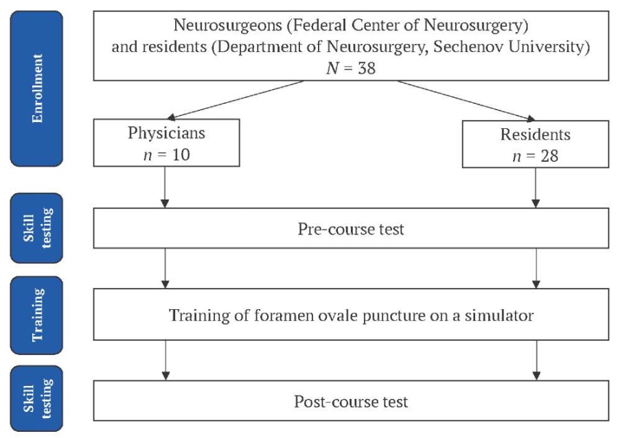 A total of 38 participants, 10 experts (neurosurgeons with more than 5 years of experience) of the Federal Center of Neurosurgery (Tyumen) and 28 residents of the Department of Neurosurgery of the Sechenov First Moscow State Medical University (Sechenov University), whose clinical site is located at Federal Center of Neurosurgery, underwent the simulation program (Fig. 4).