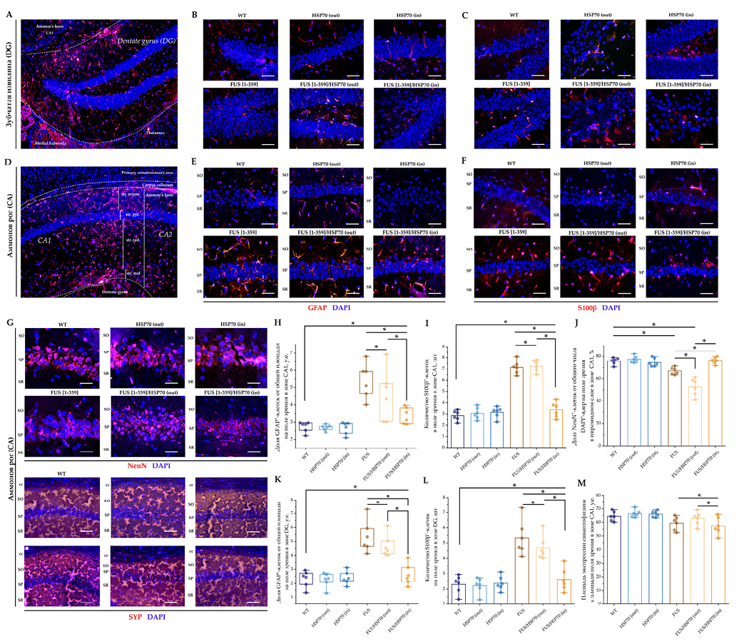 На рисунке 6 представлены результаты ИФ исследования для структур гиппокампа. В зонах DG и CA1 доля GFAP+ и количество S100β+-клеток статистически значимо повышались в группах FUS[ 1-359], FUS[ 1-359]/HSP70out и менее выраженно в группе FUS[ 1-359]/HSP70in по сравнению c группой WT (рис. 6H, I, K, L). Небольшие различия в экспрессии SYP показаны только между группами с экспрессией FUS (рис. 6M).