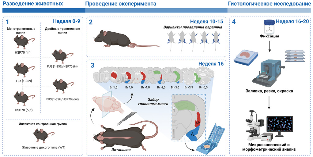 В 1-ю группу включали мышей линии C57Bl/6 (WT, контрольная группа), отбор производился методом случайных чисел. Распределение на группы со 2-й по 6-ю производили на основании генотипа животных. Ко 2-й группе отнесены трансгенные животные с человеческим геном FUS[ 1-359], экспрессирующие мутантный белок FUS с развитием FUS-варианта БАС. Использовали модель FUS-экспрессии, описанную в работе T.A. Shelkovnikova и соавт. [11]. В 3-ю группу (HSP70outвключали трансгенных мышей с внеклеточной экспрессией HSPA1A, в 4-ю группу (HSP70in– с внутриклеточной экспрессией HSPA1A. В группы со 2-й по 4-ю с учетом данных полимеразной цепной реакции отбирали животных с гемизиготным характером наследования FUS[ 1-359] и HSPA1A. Гомозиготных животных групп со 2-й по 4-ю использовали для выведения двойных трансгенных мышей: группа 5 (FUS[ 1-359]/HSP70out) и группа 6 (FUS[ 1-359]/HSP70in).