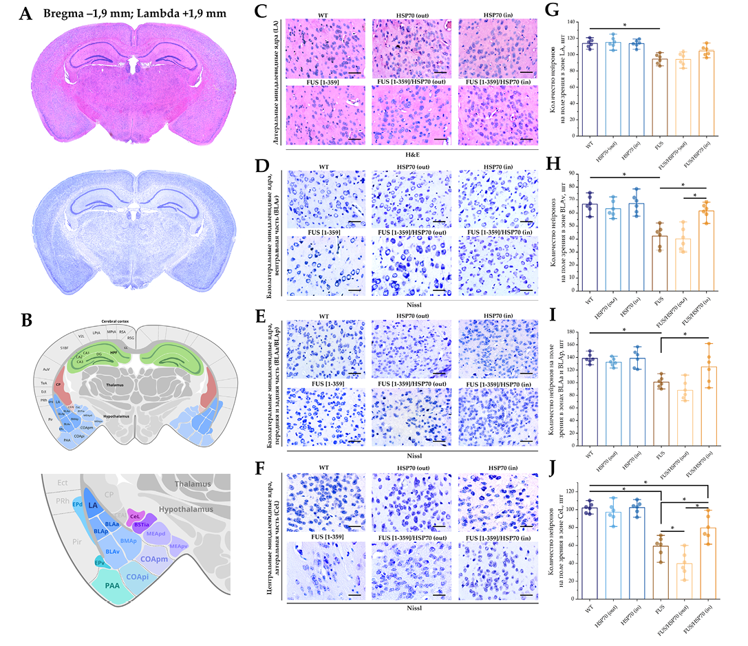 РИС. 4. Гистологическое исследование миндалевидного тела у мышей с FUS-вариантом бокового амиотрофического склероза и гиперэкспрессией HSP70.
