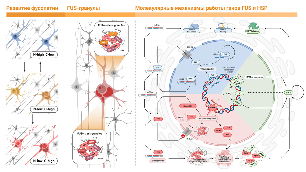 Один из генов, способных мутировать с последующим развитием БАС, кодирует у человека РНК-связывающий белок fused-in-sarcoma («слитый при саркоме»; FUS) с ядерной локализацией [5]. При мутации белок FUS покидает ядро клетки, а его патологическое накопление в цитоплазме нейронов лежит в основе FUS-варианта БАС и связанной с ним клеточной гибели [6]. Одним из перспективных направлений в изучении данной проблемы является поиск экспериментальных условий, при которых выраженность нейродегенеративных изменений, вызванных цитоплазматическим накоплением FUS, может уменьшаться.