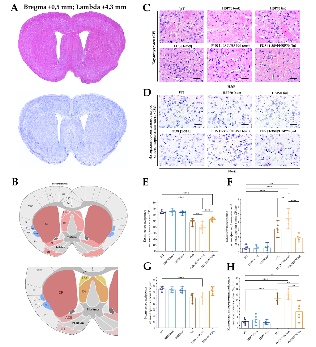 РИС. 2. Гистологическое исследование каудопутамена и каудальной части латерального септального ядра у мышей с FUS-вариантом бокового амиотрофического склероза и гиперэкспрессией HSP70.