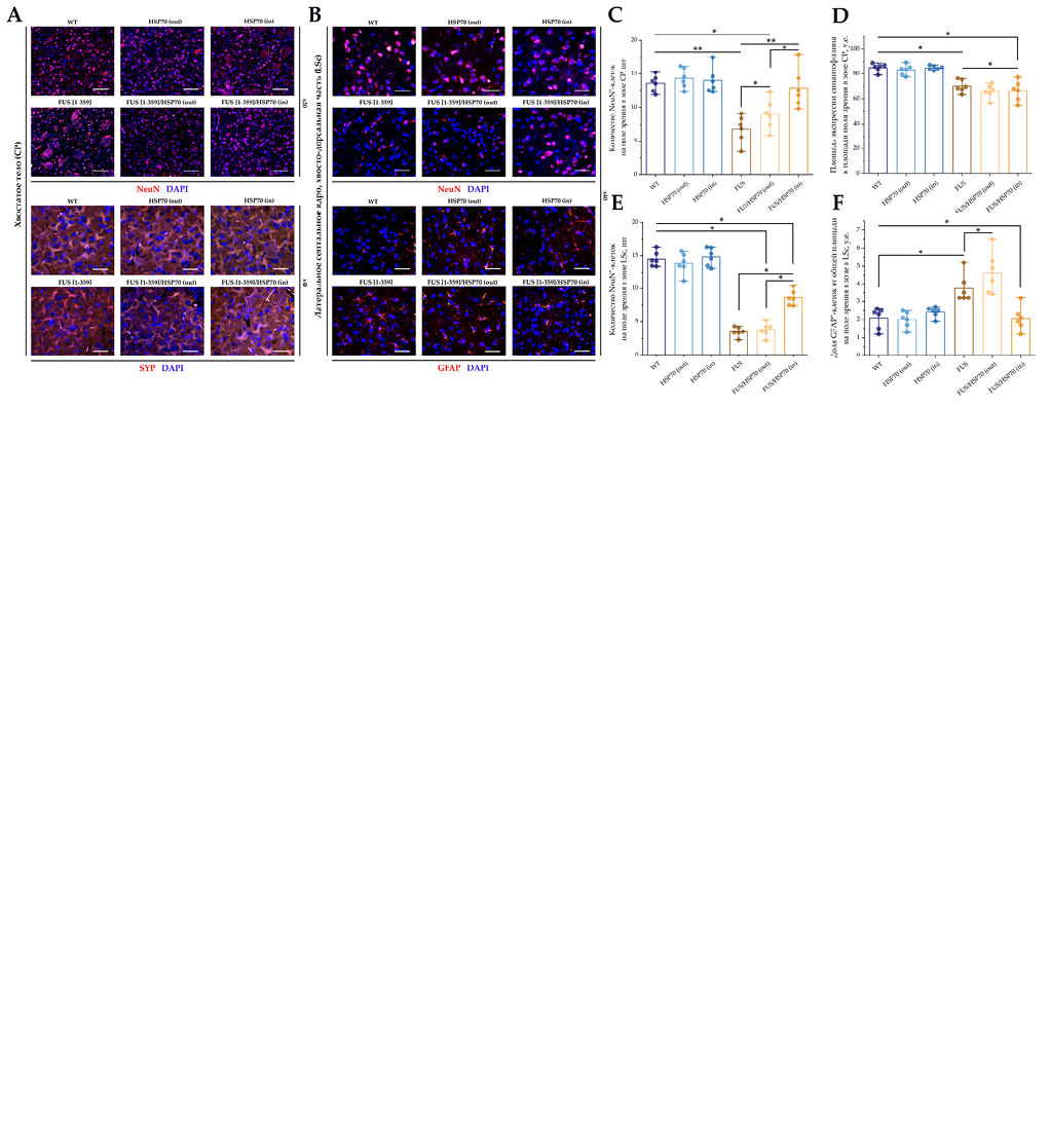 Примечание: * p < 0,05; HSP70 – белки теплового шока молекулярной массой 70 кДа; FUS – белок, «слитый при саркоме»; WT – wild type, группа контроля; DG – зубчатая извилина; CA – Аммонов рог; GFAP – глиальный фибриллярный кислый белок; NeuN – нейрональный ядерный маркер; SYP – синаптофизин.