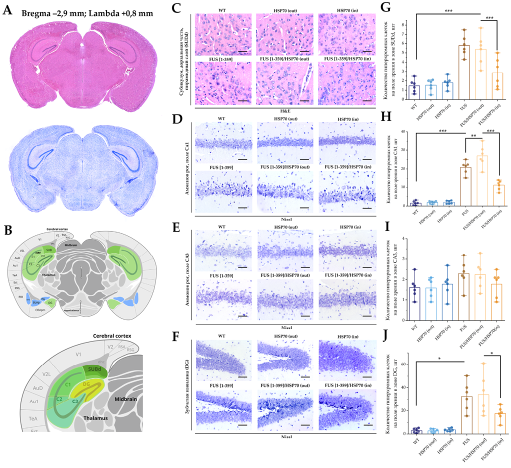 Примечание: * p < 0,05; ** p < 0,01; *** p < 0,001; HSP70 – белки теплового шока молекулярной массой 70 кДа; FUS – белок, «слитый при саркоме»; WT – wild type, группа контроля; SUBd – дорсальная часть основания гиппокампа; CA – Аммонов рог; DG – зубчатая извилина.