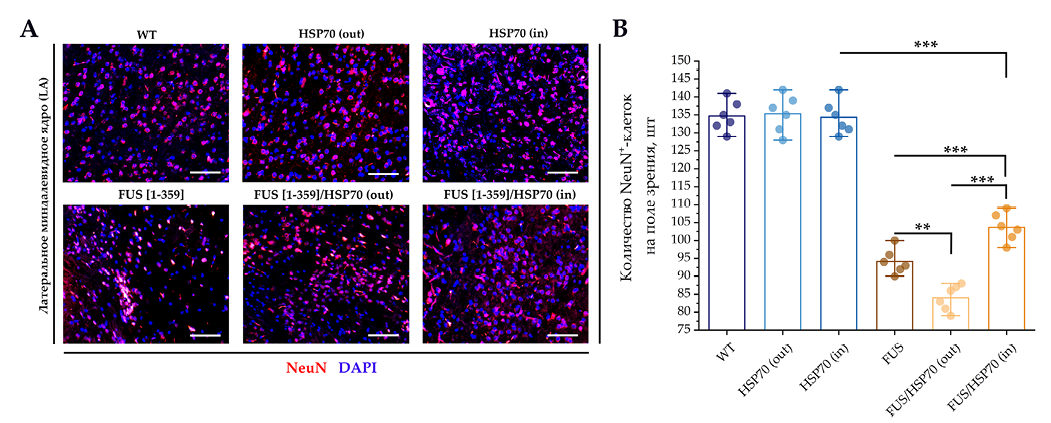 На рисунке 7 показаны результаты ИФ исследования в зоне LA. Во всех группах с экспрессией FUS (FUS[ 1-359], FUS[ 1-359]/HSP70out и FUS[ 1-359]/HSP70in) количество NeuN+-клеток было меньше по сравнению с группой WT и группами с моноэкспрессией HSP70. В то же время среди групп с мутантным FUS экспрессия NeuN была выше в группе FUS[ 1-359]/HSP70in, ниже – в группе FUS[ 1-359]/HSP70out.