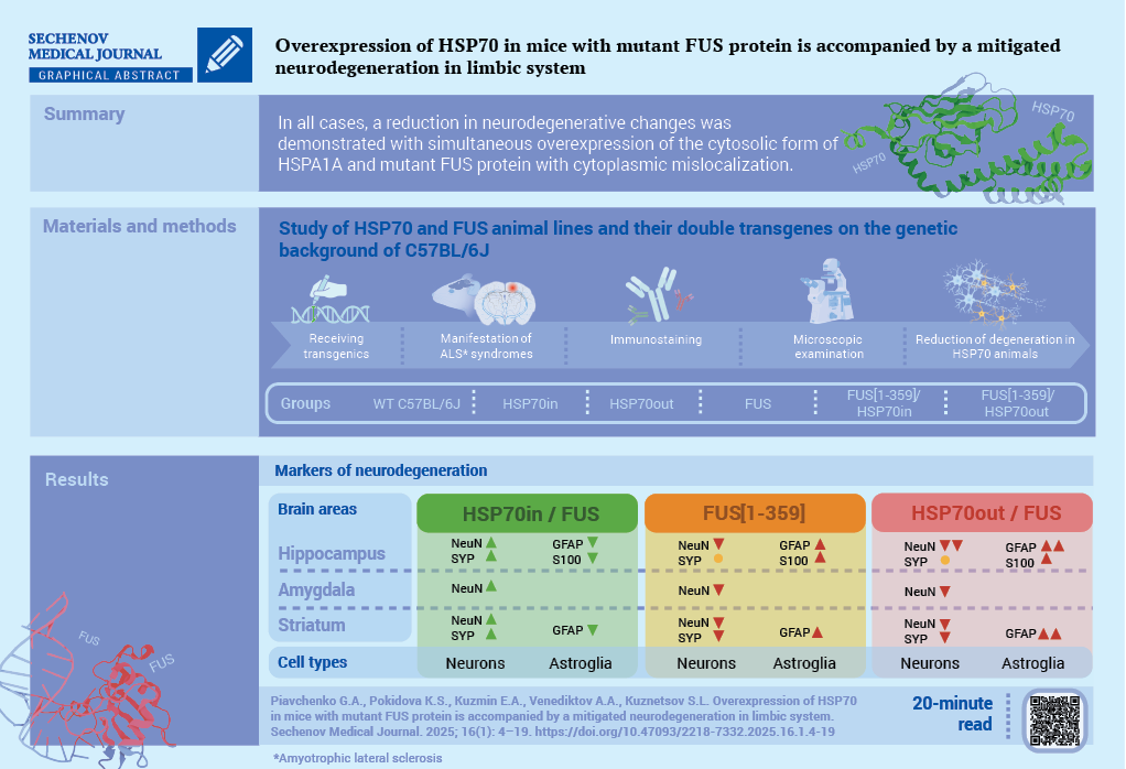 25. Piavchenko G.A., Pokidova K.S., Kuzmin E.A., et al. Quantitative Immunofluorescence Mapping of HSP70’s Neuroprotective Effects in FUS-ALS Mouse Models. Appl. Sci. 2024; 14(24): 11614. https://doi.org/10.3390/app142411614
