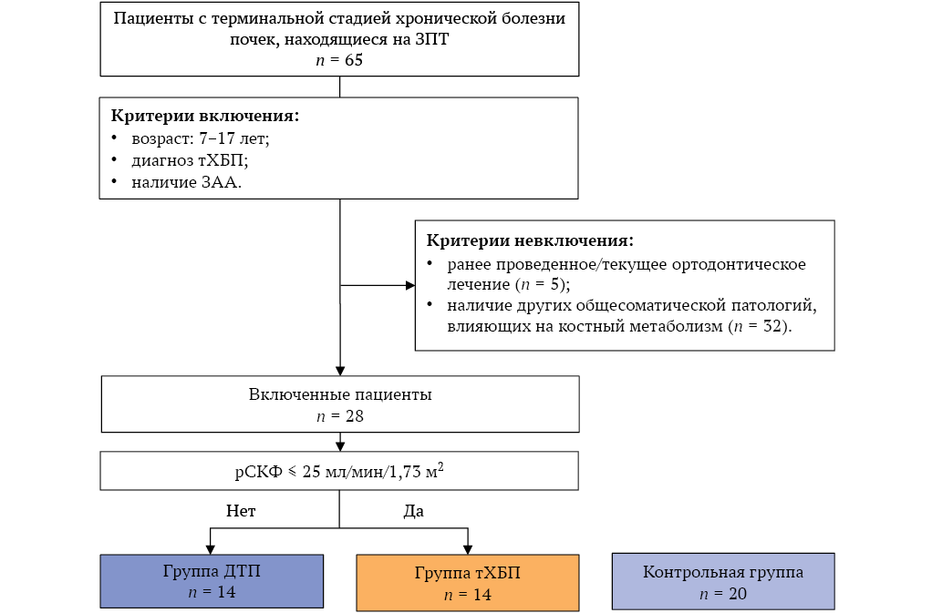 Примечание: тХБП – терминальная стадия хронической болезни почек, ЗЧА – зубочелюстные аномалии, ЗПТ – заместительная почечная терапия, ДТП – дисфункция трансплантата почки, рСКФ – расчетная скорость клубочковой фильтрации по формуле CKiD U25.