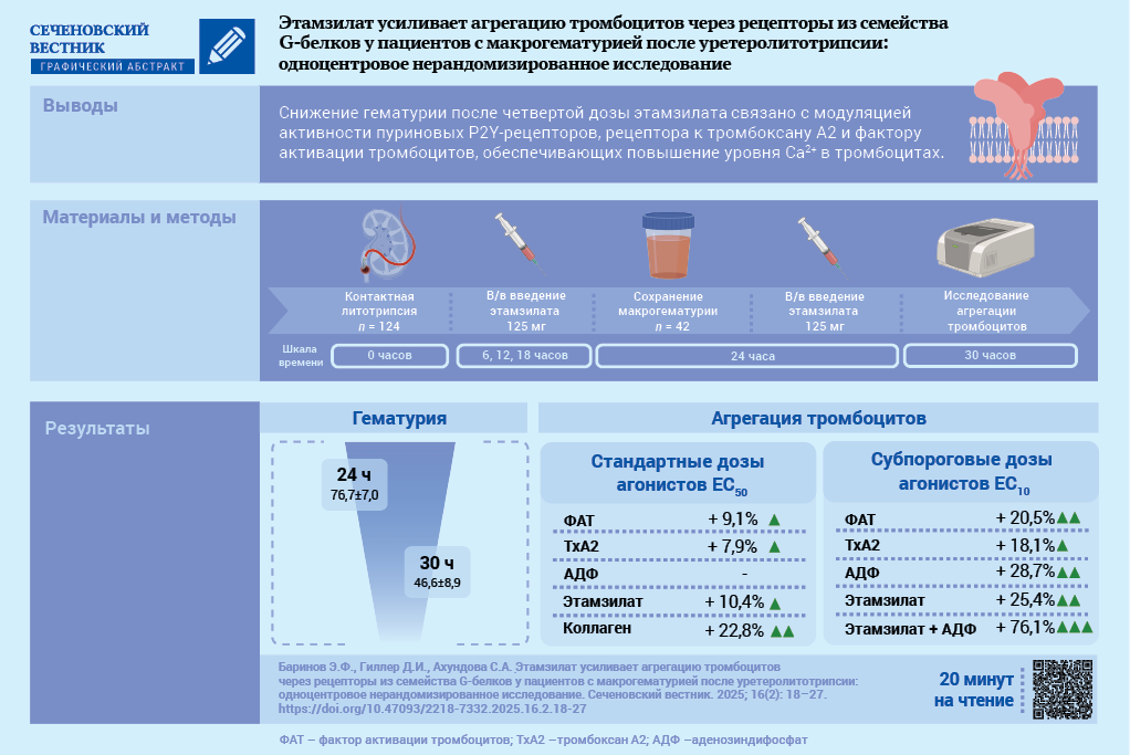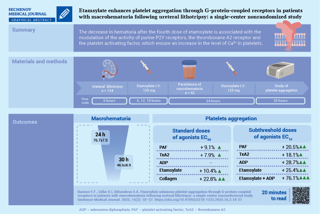 Results. After administration of the fourth dose of etamsylate, macrohematuria significantly decreased compared to baseline values: 46.6 ± 8.9 vs. 76.7 ± 7.0 red blood cells per field of view (p < 0.001). After administration of the fourth dose of etamsylate, upon stimulation with standard agonist concentrations (EC50), there was a significant increase in the activity of the PAF receptor by 9.1% (p = 0.007), the thromboxane prostanoid receptor by 7.9% (p = 0.006), the glycoprotein VI receptor by 22.8% (p < 0.001), and ethamsylate-induced platelet aggregation by 10.4% (p < 0.05). The maximal aggregatory response using subthreshold agonist concentrations (EC10) was observed when platelets were incubated simultaneously with ethamsylate and ADP: amplitude, slope, and AUC (area under the curve) increased by 16.9%, 60.0%, and 54.7%, respectively, compared to isolated stimulation of P2Y receptors (p < 0.05), and by 26.2%, 77.2%, and 65.6%, respectively, compared to incubation with ethamsylate alone (p < 0.05).