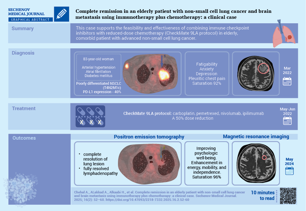 Ethics statements. Consent statement. The patient consented to the publication of the article “Complete remission in an elderly patient with non-small cell lung cancer and brain metastasis using immunotherapy plus chemotherapy: a clinical case” in the “Sechenov Medical Journal”.